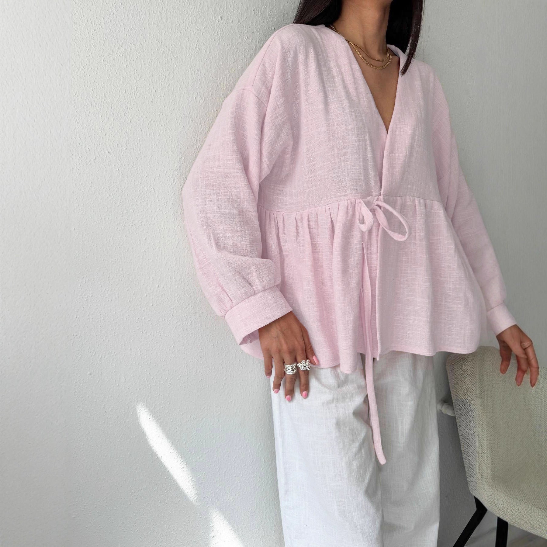 - Moderne Details: Der V-Ausschnitt und die leicht gepufften Ärmel verleihen der Bluse einen femininen Touch.