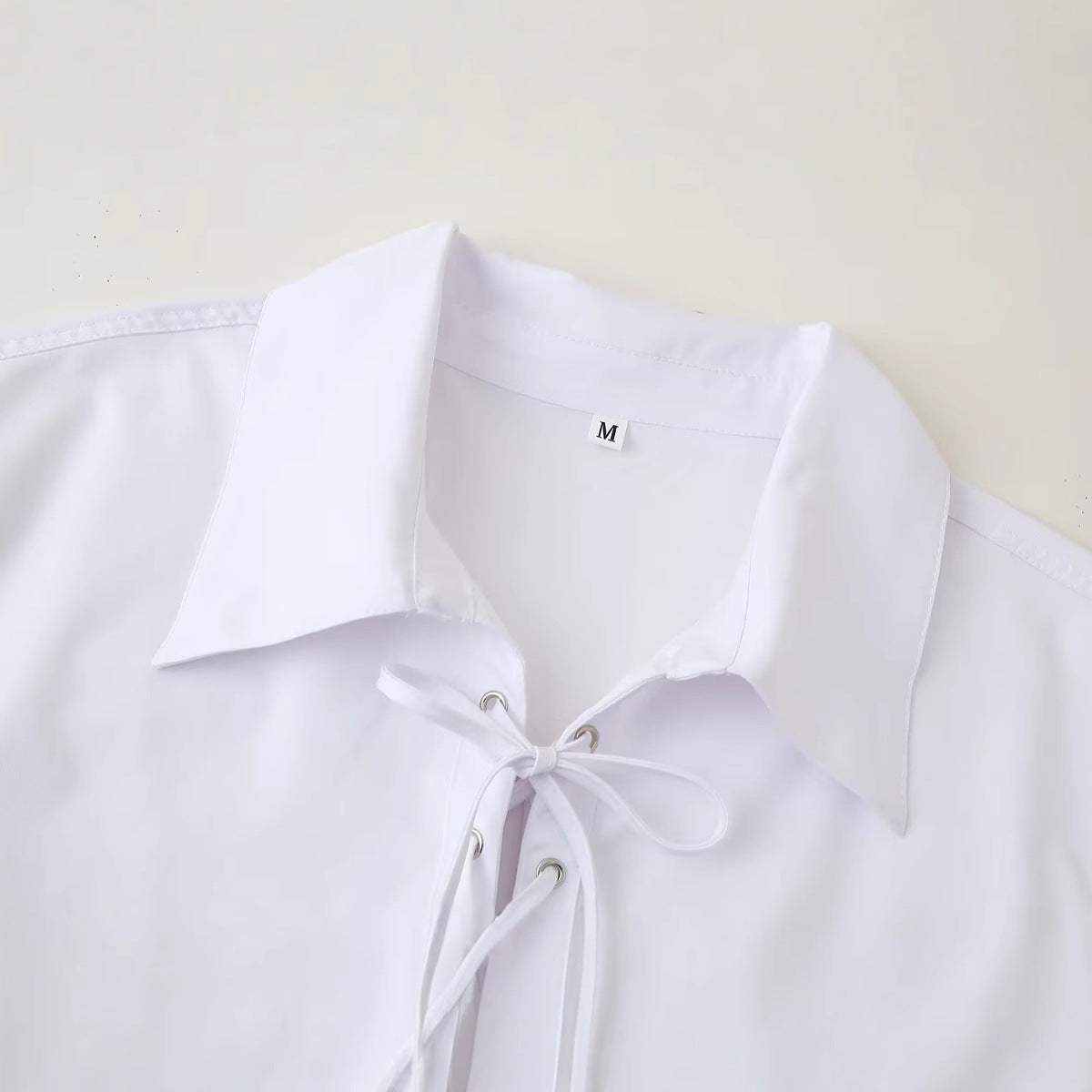 • Schnürdesign: Das besondere Schnür-Detail an der Vorderseite verleiht der Bluse einen modernen, verspielten Touch.
