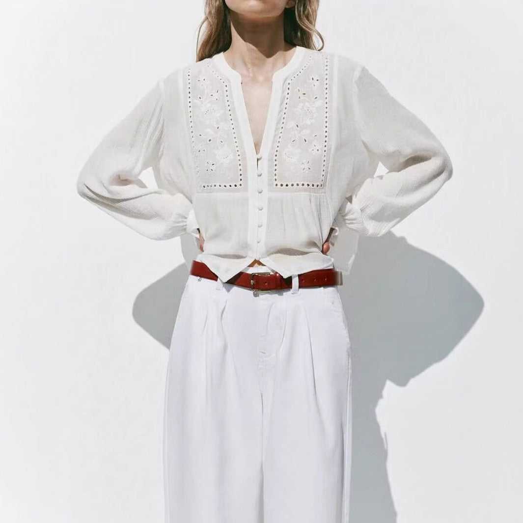 - Detailreiche Stickerei: Die Bluse ist mit feinen, handgearbeiteten Stickdetails verziert, die ihr einen Hauch von Raffinesse verleihen.