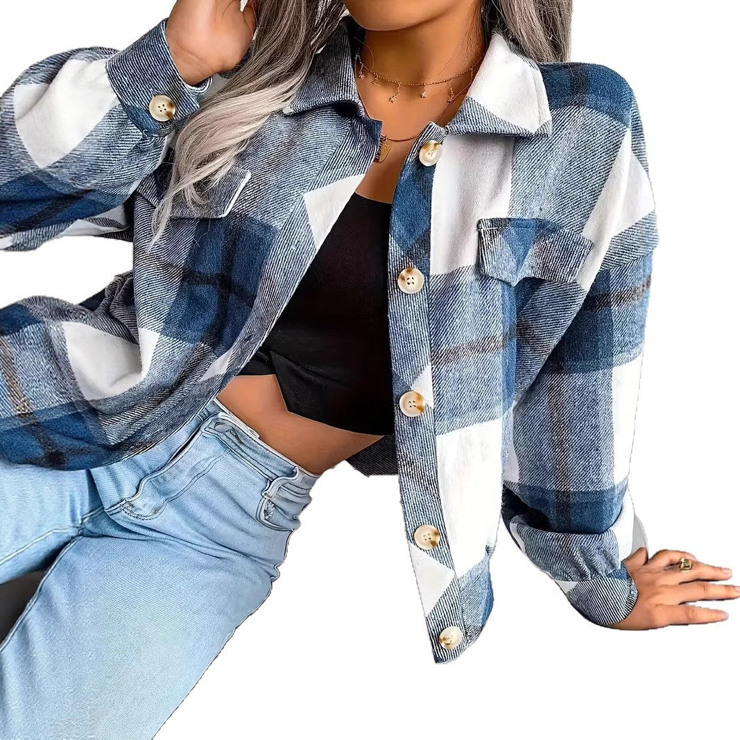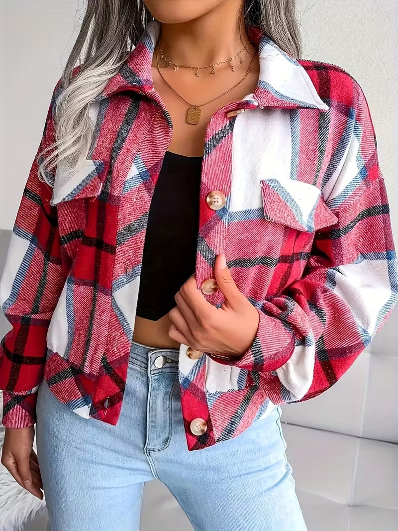 Damen Lässige Karobluse mit aufgesetzten Taschen und Knopfverschluss Fudus