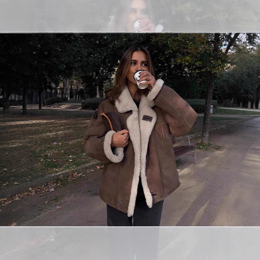 Damen lässige Lederjacke mit kunstfellgefüttertem Kragen und Knopfdetails Fudus