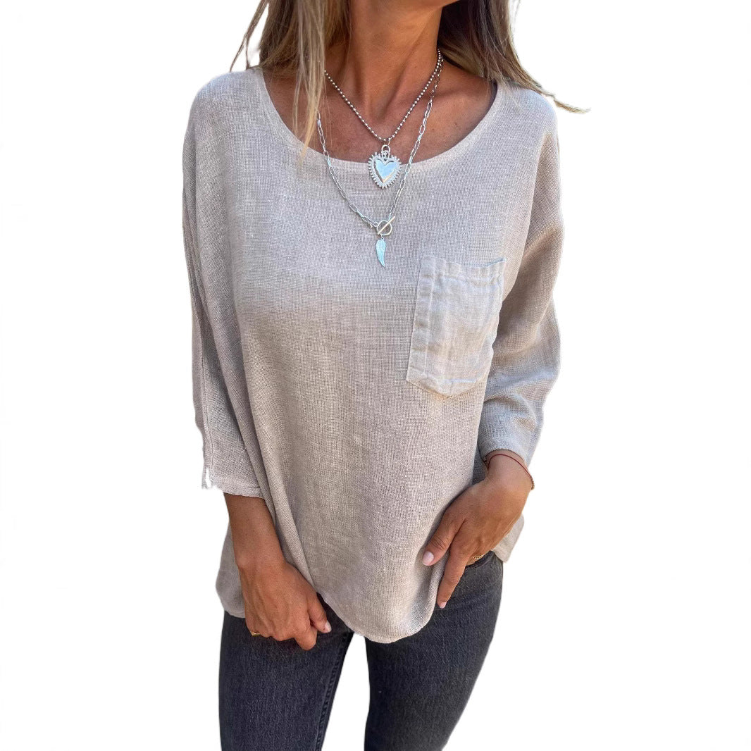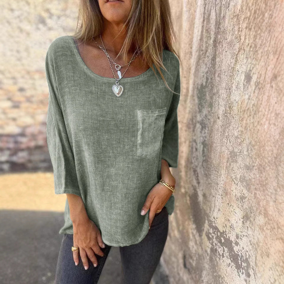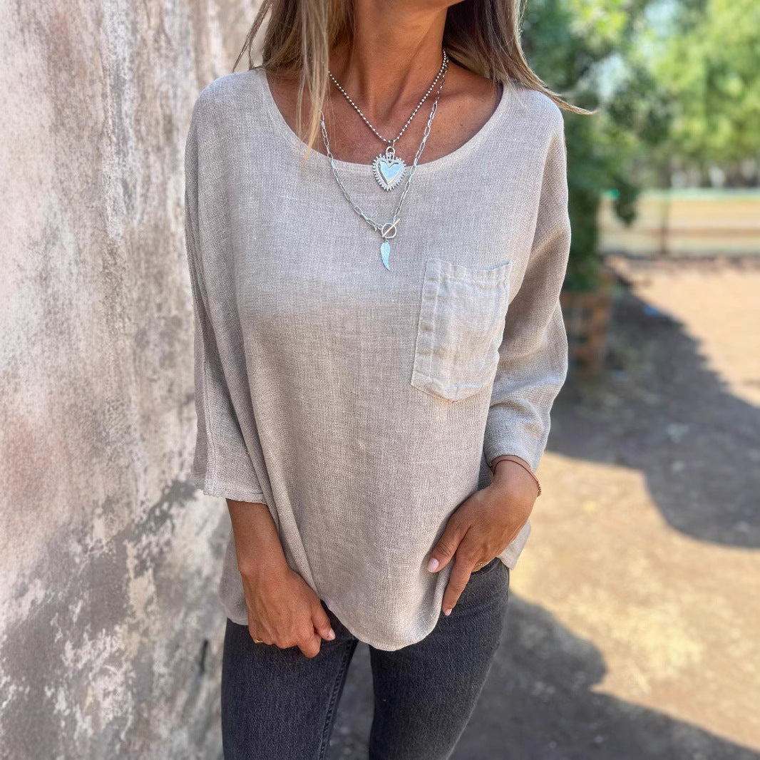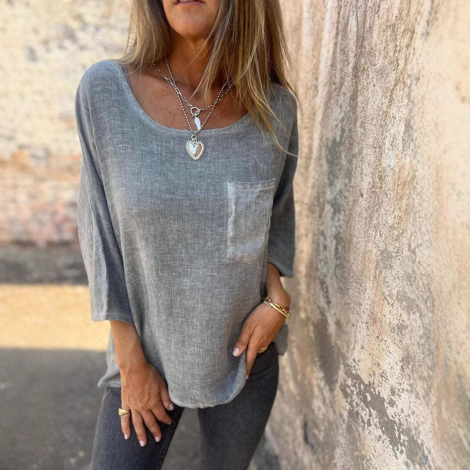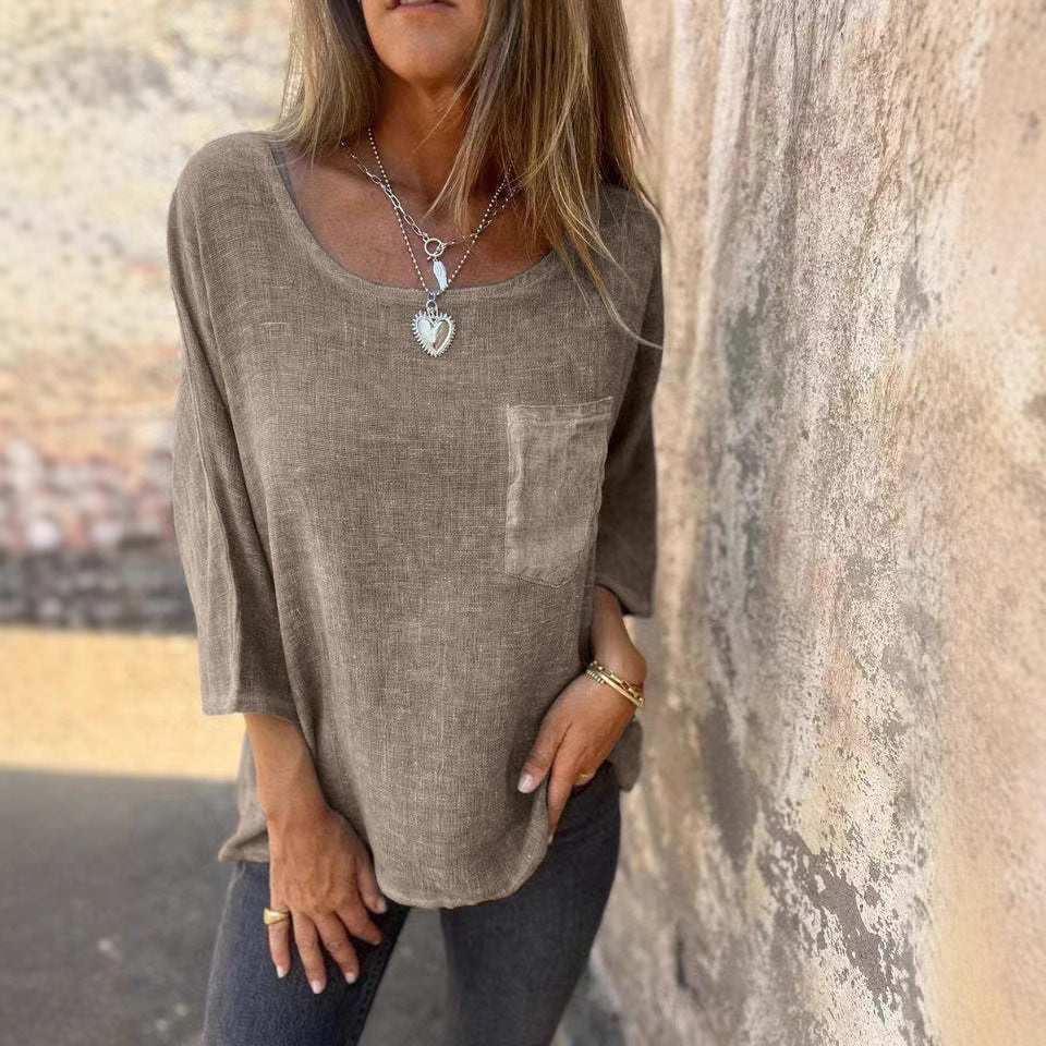 Damen lässige Leinenbluse mit aufgesetzter Tasche Fudus