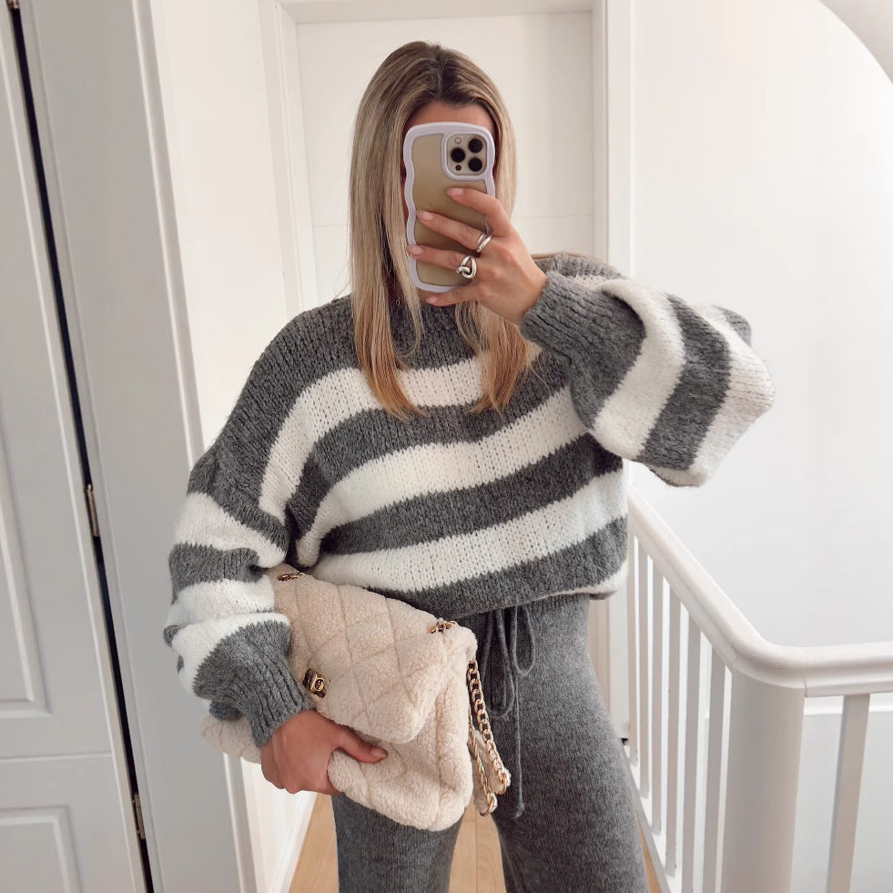 Damen modischer Cropped Pullover mit einzigartigem Streifenmuster und weit geschnittenen Ärmeln Fudus