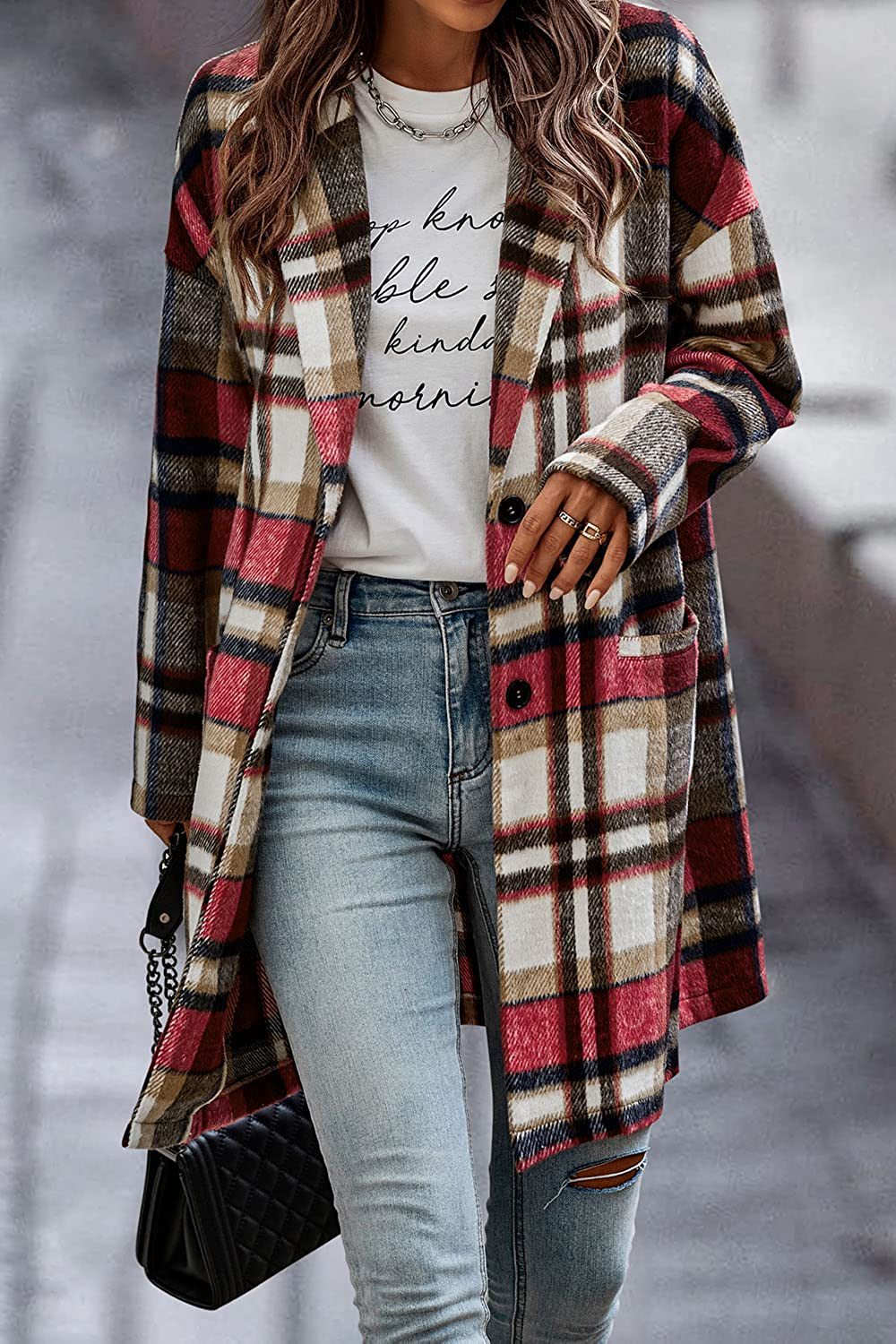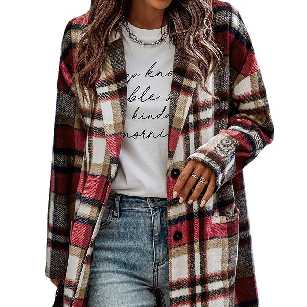 Damen Modischer Karomantel mit tiefem Kragen und praktischen Taschen Fudus