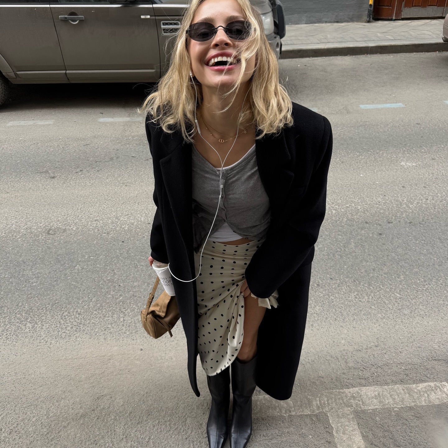 Entdecken Sie unseren Damen modischen Midirock mit elegantem Punktdesign und hohem Schlitz. Dieser Rock kombiniert zeitlose Eleganz mit einem modernen Twist und eignet sich perfekt für jede Gelegenheit, sei es im Büro, beim Brunch oder beim Abendessen mit Freunden.