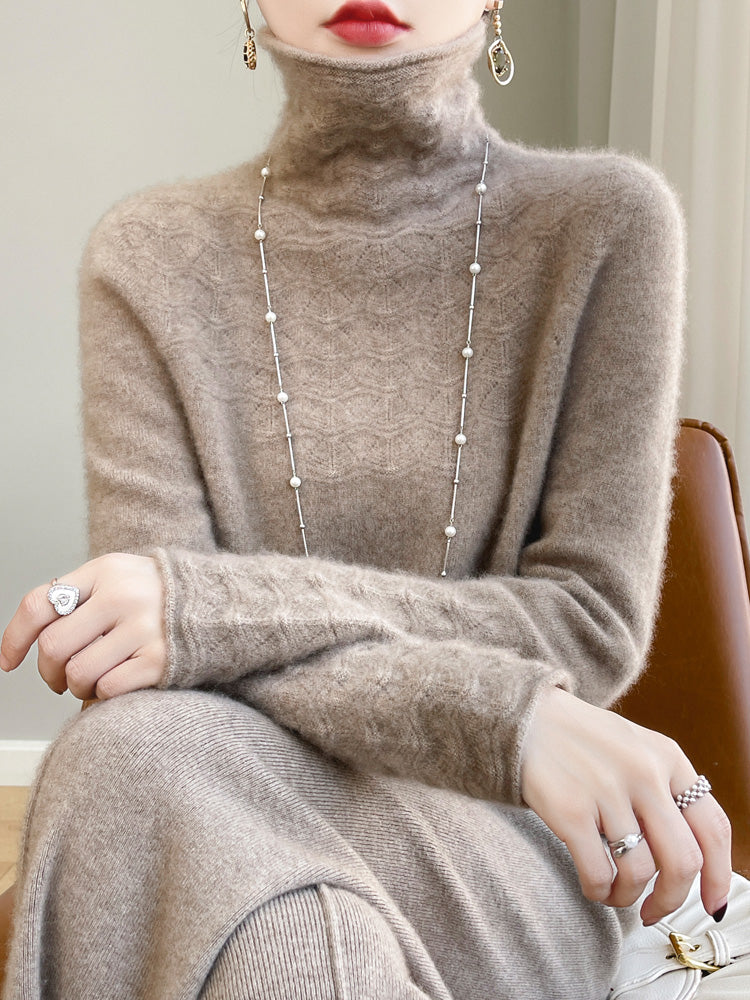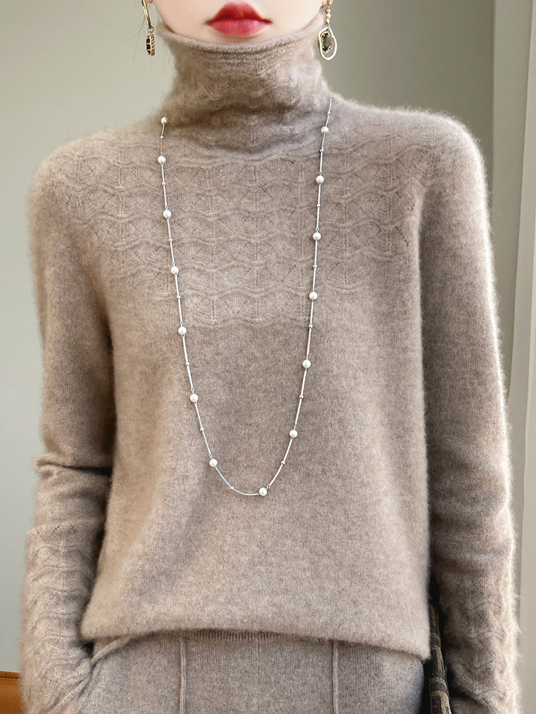 Entdecken Sie den exquisiten Rollkragenpullover, gefertigt aus hochwertiger Wolle und edlem Kaschmir, ideal für Frauen, die Eleganz und Bequemlichkeit schätzen. Dieser Pullover überzeugt durch seine weiche und warme Textur auf der Haut und ist somit perfekt für die kalte Jahreszeit. Dank der feinen hölzernen Druckdetails und dem zeitlosen Rollkragen-Stil verleiht dieses Kleidungsstück jedem Outfit mühelos einen Hauch von Raffinesse.