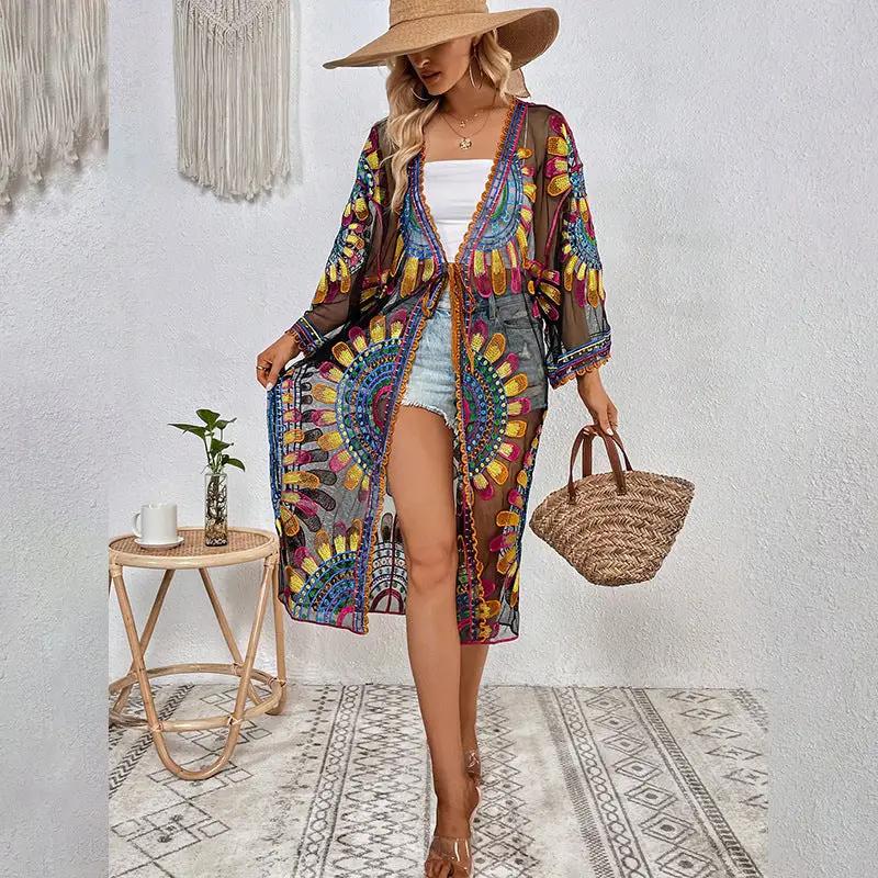 Dieser Neuer Strandrock Lässiger Urlaub Spitzen-Cardigan Bikinianzug Cover-Up Sonnenschutz Kleidung besteht aus 100% Polyester, ist leicht und atmungsaktiv, ideal für heiße Sommertage. Mit einem Spitzen-Design und einem Selbstdesign-Muster verleiht dieses Cover-up Ihrem Strandlook einen Hauch von Eleganz. Es fällt größentreu aus, hat keine Elastizität und ist perfekt für Strand, Urlaub und Kreuzfahrten im Freizeit-Stil.